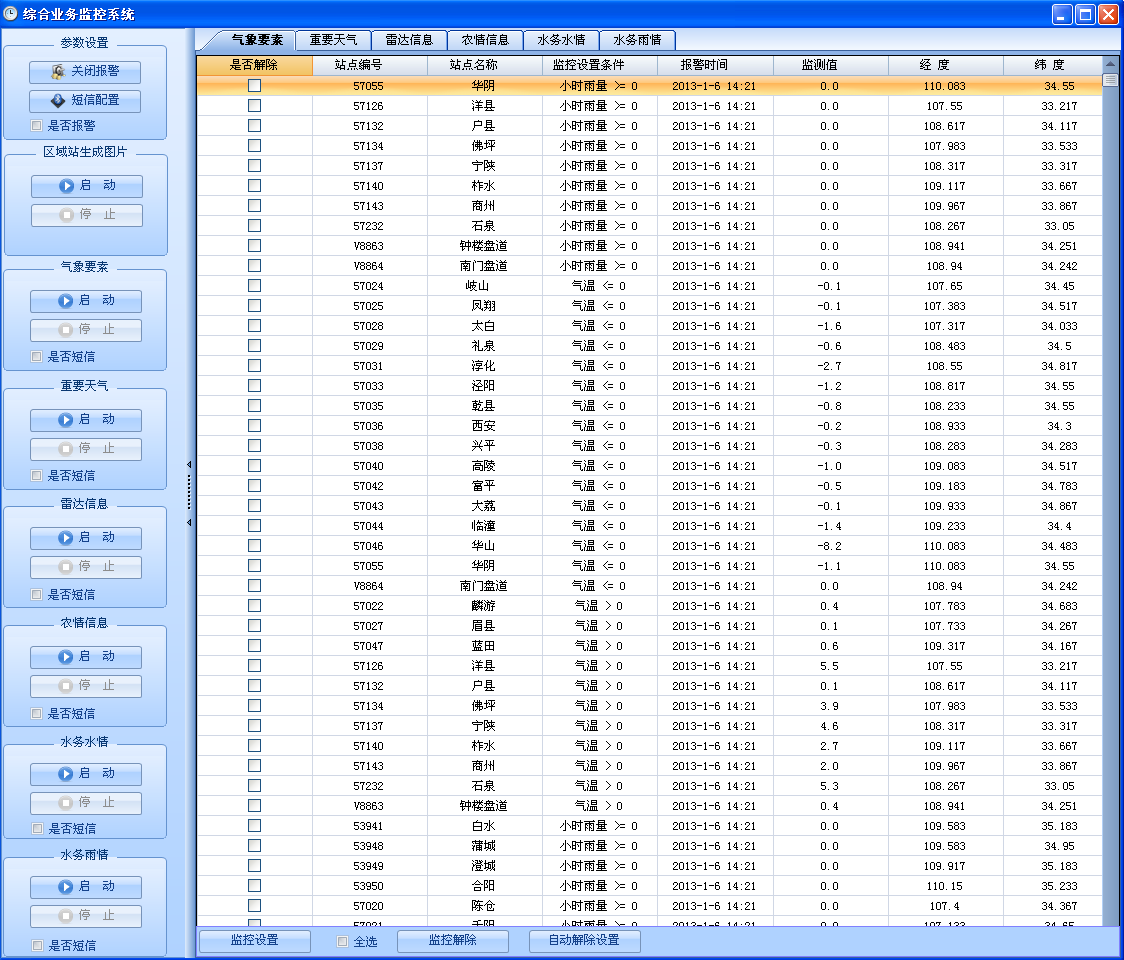 保险数据监控系统实现与保险气象相关气象观测要素的实时阈值监控,采用多线程方式运行,可实现监控时效设置、监控频率设置、监控功能设置、监控信息展示与管理、报警短信联系人管理、监控报警短信发送等功能,当实时气象要素数据达到或超过预先设定的阈值时,就会发出告警信息,将以短信报警、声音报警、软件闪烁报警三种方式予以提示,短信报警发送给暂时外出的值班人员,后两种方式用于提示办公室值班人员。